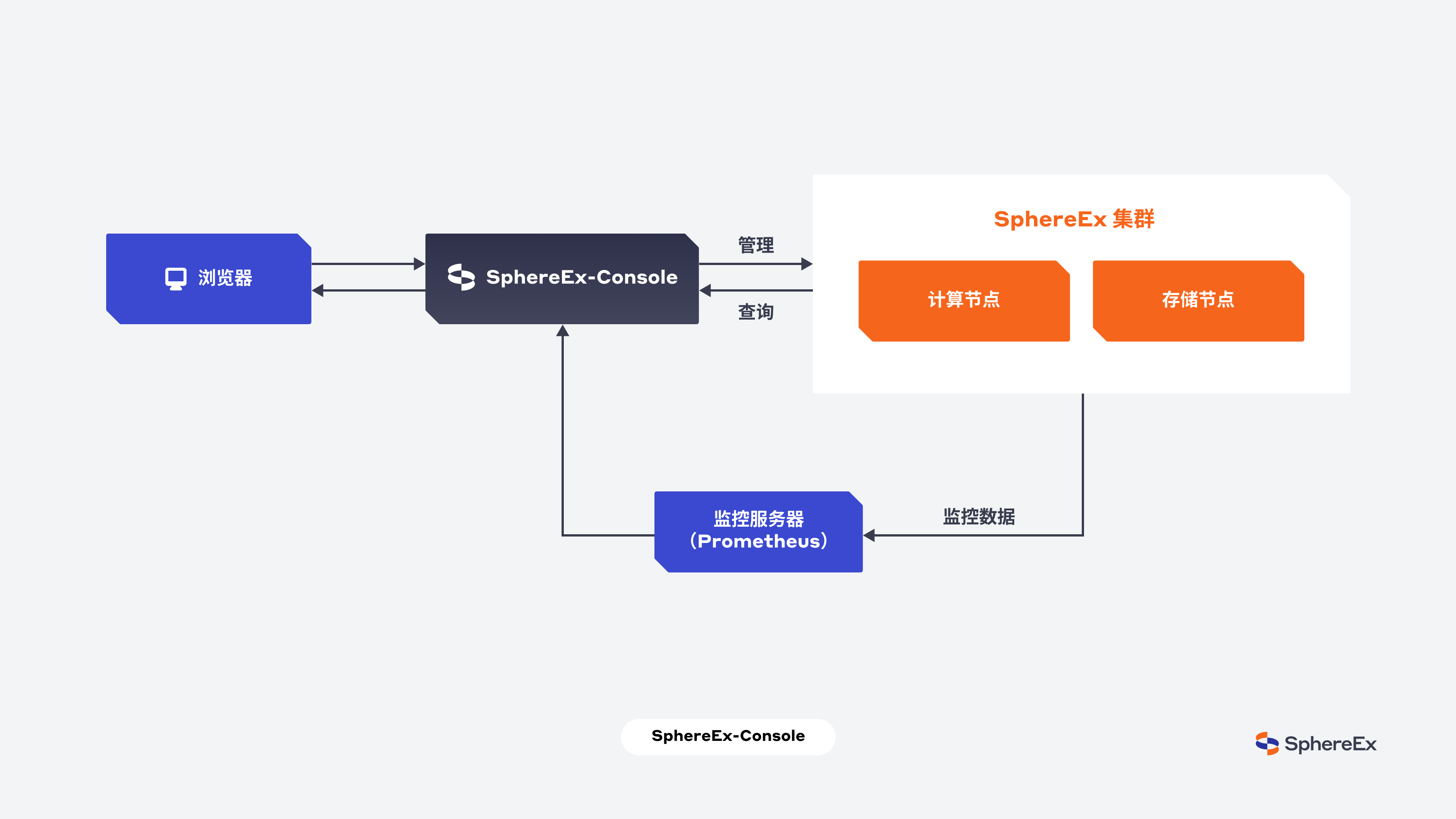 用户通过浏览器登录系统,然后在 SphereEx-Console 中对 SphereEx 企业数据服务平台的集群进行管理。SphereEx-Console 查询的监控数据来自集群中主机、计算节点导出到 Prometheus 服务器的数据。