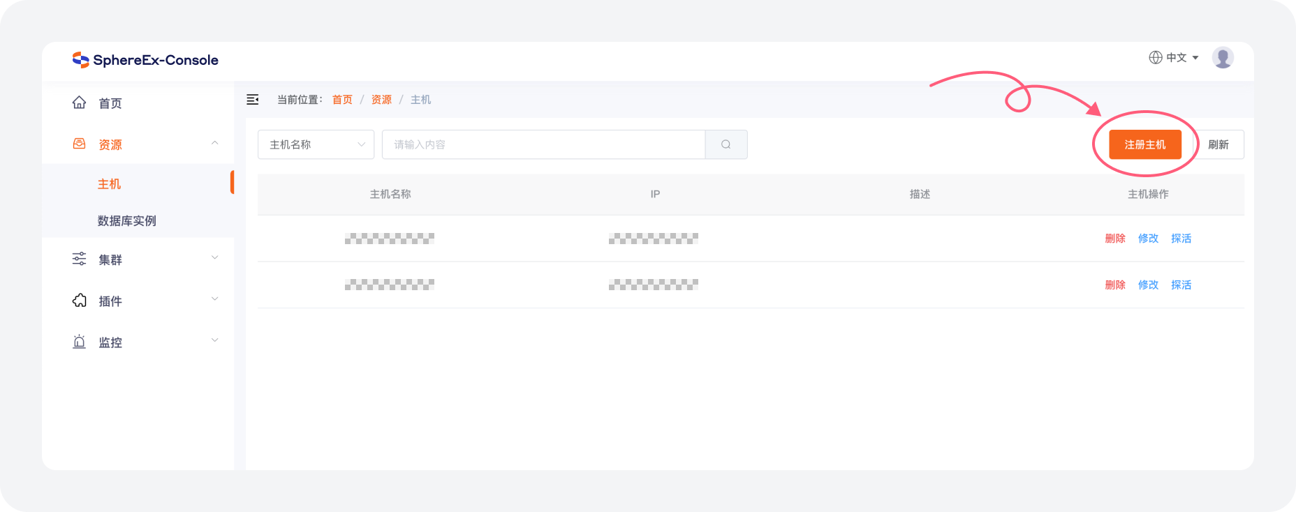 a. 在 资源 > 主机 菜单中点击 注册主机 按钮。