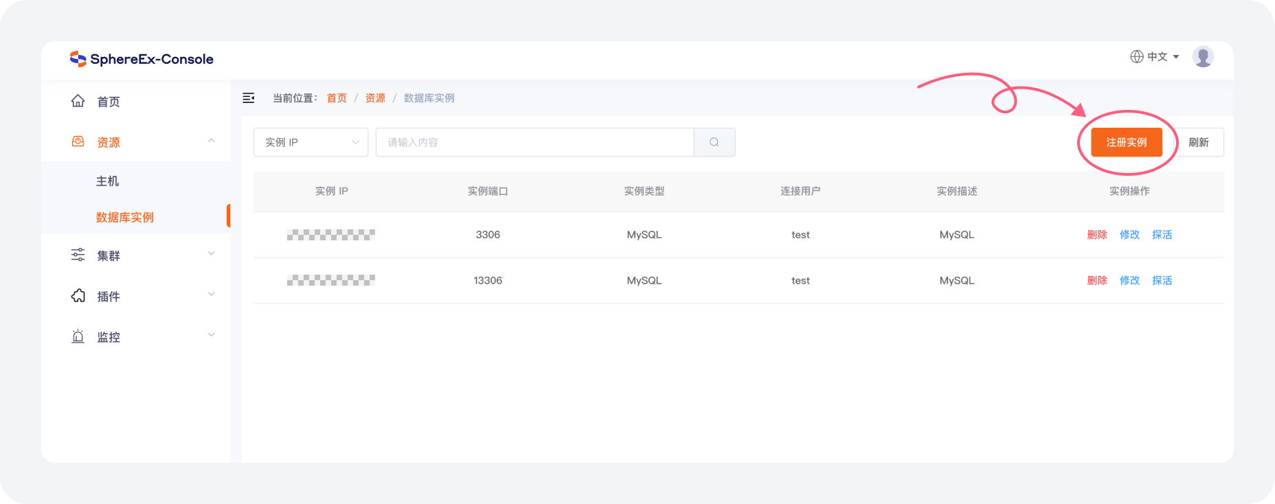 a. 在 资源 > 数据库实例 菜单中点击 注册实例。