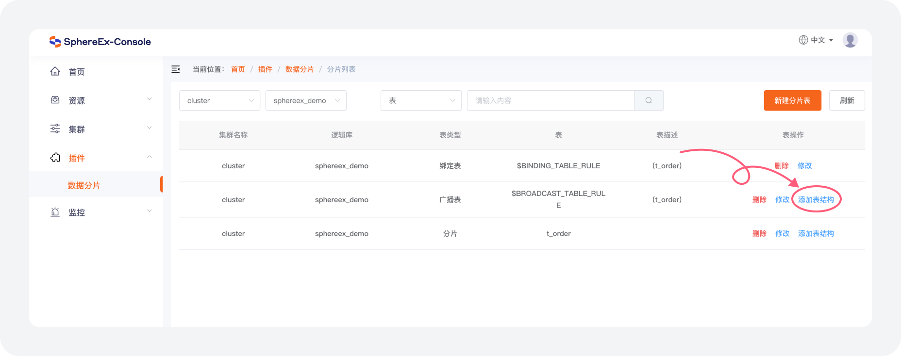 d. 在创建好分片规则后可以点击 添加表结构 使用正常建表语句创建实际数据库表。