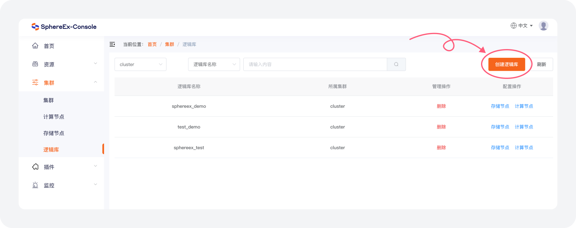 a. 在 集群 > 逻辑库 菜单中点击 创建逻辑库。