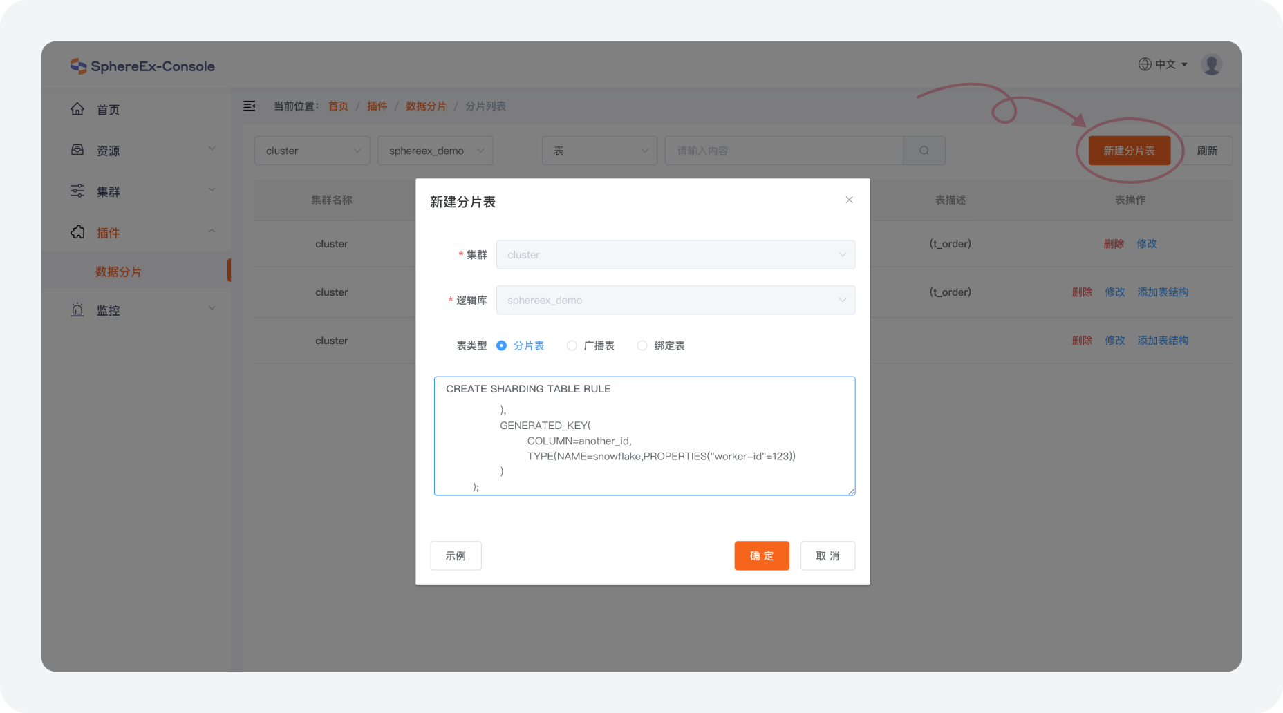 b. 选择对应的集群和集群下对应的逻辑库后,点击 创建分片表 后可以在对应的逻辑库下使用 DistSQL 创建分片表、广播表。