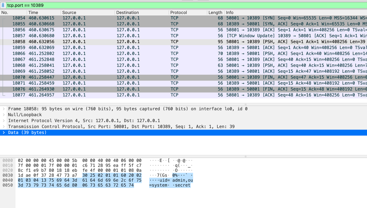 从抓取的 TCP 数据包中,我们可以轻松的找到一条包含用户 DN 和密码的报文: